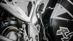"Il ne fallait pas que la machine ressemble à ci ou ça comme une réplica. Il a donc fallu créer une ligne générale qui soit moderne et exclusive". Multiples pièces en carbone (le support compte-tours est un vrai modèle de Grand Prix), double optique très contemporaine, prise d’air frontale inspiration MotoGP, feu arrière intégré, dimensions des clignos, platines de repose-pieds taillées masse, la RS ressemble vraiment a un modèle de la production actuelle. Le côté tuning a soigneusement été évité. Regardez comment la béquille s'insère dans le carénage, du grand art !