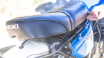 Un cylindre gros comme ca, un long pot d’échappement qui remonte jusqu’à l’arrière de la machine, le profil de la 400 TS est sans équivoque : c’est une machine agressive issue de la célèbre version cross (TM) avec juste des phares et des clignos ! Cette année là, Suzuki est d'ailleurs double Champion du Monde de cross en 500 et en 250 !