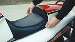 Sortir le superbe kick en alu du carénage ( il pivote vers l’arrière puis s’articule ) , mettre le starter ( à gauche planqué derrière le carénage ) mettre le contact, écouter le bzzz-bzzz de l’YPVS et kickez. Le son est sans appel, c’est un 2 temps, un 4 cylindres 2 temps à la voix si caractéristique. Derrière le dosseret, 4 traits de fumées ponctuent chaque coup de gaz. Quelle ambiance et vous n’avez meme pas démarré !
