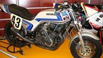 Ainsi, le team Américan Honda par exemple débarque en 80 avec 4 motos ......et le tout jeune Freddie Spencer ( 19 ans ) ! La CB 750 F est boostée mais dramatiquement fragile la première année : Fast Freddie en garde un " grand" souvenir : "Le moteur explosait littéralement, les bielles cassaient......des chevaux il y en avait mais de la fiabilité pas encore !" De 77 ch d'origine, la 750 ( portée à 1024 conformément au règlement ) va grimper jusqu'à 147 cv ! Bielles titane, allumage déporté pour gagner en largeur. La moto a gardé la déco type Bol d'Or d'origine et les roues sont dorées. Cette version de la première année est facile à reconnaitre.