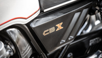 105 chevaux, 24 soupapes, une cathédrale à 6 cylindres, 6 carburateurs, 10 000 tours, voici comment on peut résumer une 1000 Honda CBX : une sorte de moto au superlatif. Tout en plus : plus de puissance, plus de cylindres, plus de luxe . Sous le sigle Honda du réservoir est marqué SuperSport avec Super en rouge … Comme le X du cache latéral ou les éléments des instruments de bords ! Ca va saigner !