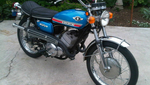 Kawasaki avec les Samourai 250 SS puis Avenger 350 SS (SS est le signe des Scrambler). Celles-ci vont avoir deux évolutions esthétiques : du réservoir typé sixties avec chrome et grippe-genoux, elles vont se simplifier avec des réservoir unis. Mais la pièce la plus remarquable des Kawa SS est la ligne d’échappement sublime sur le côté droit !